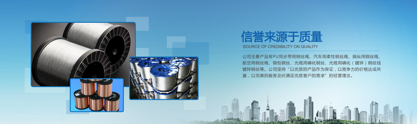 公司主要產(chǎn)品有PU同步帶用鋼絲繩、汽車用柔性鋼絲繩、操縱用鋼絲繩、航空用鋼絲繩、銅包鋼絲、光纜用磷化鋼絲、光纜用磷化(鍍鋅)鋼絞線、鍍鋅鋼絲等。經(jīng)過多年的研究、摸索、開發(fā),公司已形成了完整的技術(shù)、工藝軟件,產(chǎn)品實(shí)物質(zhì)量均達(dá)到國(guó)際先進(jìn)水平。